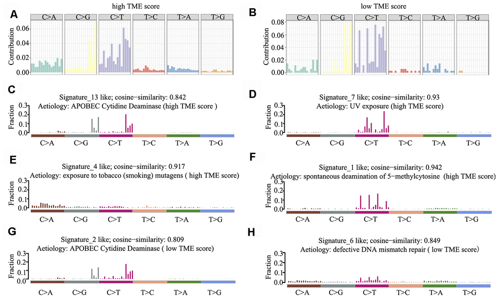 Using 1,000 iterations of non-negative matrix factorization [28], we then performed cosine similarity analyses to compare mutational signatures in HNSCC with current COSMIC; consequently, six independent and stable mutational signatures were identified. De novo signatures identified in the high TME score group were enriched in APOBEC cytidine deaminase signature (COSMIC Signature 13; cosine similarity: 0.842), UV exposure (COSMIC Signature 7; cosine similarity: 0.93), tobacco mutagens (COSMIC Signature 4; cosine similarity: 0.917) and spontaneous deamination of 5-methylcytosine (COSMIC Signature 1; cosine similarity: 0.942) (Figure 5C–5F). In contrast, de novo signatures identified in the low TME score group were enriched in APOBEC cytidine deaminase signature (COSMIC Signature 13; cosine similarity: 0.809) and defective DNA mismatch repair (COSMIC Signature 6; cosine similarity: 0.849) (Figure 5G, 5H). C > T and C > G mutations at TpCpN trinucleotides were attributed to the overactivity of the AID/APOBEC family of cytidine deaminases. These data indicate that the overactivity of APOBEC family genes may be involved in HNSCC tumorigenesis and immune outcome.