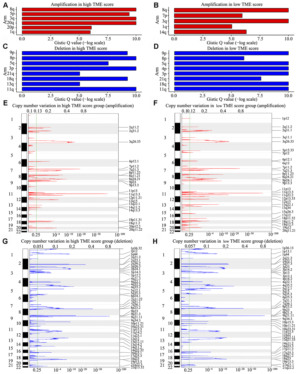 We observed that 98% HNSCC samples had CNVs at the chromosome arm level, including loss at 3p, 4p, 5q, 8p, 9p, 11q, 13q, 18q and 21q and gain at 1q, 3q, 5p, 8q, 14q, 20p and 20q. Analyses using GISTIC indicated that the chromosome arm level had a significant gain at 8q and 20q in the high TME score group (Figure 6A) and at 8q, 3q and 3p in the low TME score group (Figure 6B); moreover, the chromosome arm level had a significant loss at 8p, 3p and 11q in the high TME score group and at 9p, 5q and 4p in the low TME score group (Figure 6C, 6D). Similar SNV and CNV profiles along with similar RNA expression patterns supported that HNSCC belongs to the “squamous” molecular subtype, as identified by Hoadley et al. [29]. We also identified 13 focal regions with recurrent gain of copy number and 20 regions with recurrent loss of copy number (both q < 1e−4), in which many genes have previously been identified to be tumor-associated genes (Supplementary Table 4). Among them, three recurrent focal amplifications (11q13.3, 7p11.2 and 3q26.33) (Figure 6E, 6F) and three recurrent focal deletions (9p21.3, 8p23.2 and 4q35.2) (Figure 6G, 6H) were identified for the first time in the TME score groups.