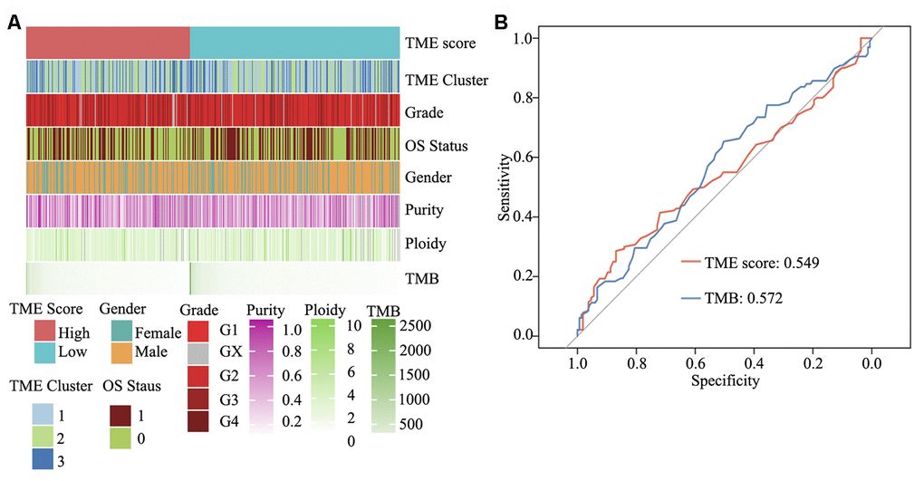 To elucidate the molecular characteristics of HNSCC, according to information pertaining to the TME clusters and TME score groups, as well as tumor purity, malignant cell ploidy, tumor mutation burden (TMB) and clinical information (age, grade and OS status), a comprehensive genomic landscape of HNSCC samples was integrated and has been depicted in Supplementary Table 5. As shown in Figure 7A and Supplementary Figure 1C and 1D, no difference was present between the high and low TME score groups with regard to tumor ploidy and malignant cell purity. However, consistent with TMB, TME score was able to significantly differentiate between high- and low-risk HNSCC. TMB, in concert with PD-L1 expression, is reportedly a useful biomarker for immune checkpoint blockade selection in diverse cancers [30]. Herein ROC analysis showed that in comparison with TMB, TME score is a similar efficacious biomarker to determine the effectiveness of immunotherapy in patients with HNSCC (area under ROC: 0.549 vs. 0.572, P = 0.64) (Figure 7B).