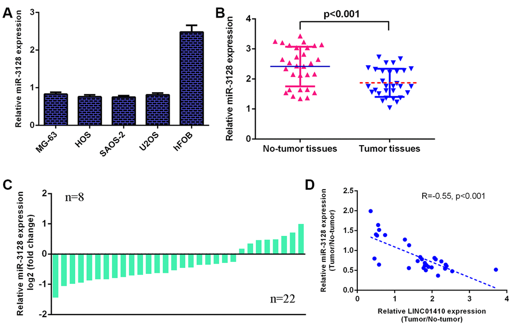 Furthermore, miR-3128 expression was investigated in osteosarcoma cells. We determined that miR-3128 was decreased in osteosarcoma cells (MG-63, HOS, SAOS-2 and U2OS) compared with osteoblast cells (hFOB1.19) (Figure 2A). The miR-3128 level was lower in osteosarcoma specimens than in control normal samples (Figure 2B). The expression of miR-3128 was downregulated in 22 osteosarcoma patients compared to control normal samples (Figure 2C). There was an inverse correlation between miR-3128 and LINC01410 in osteosarcoma specimens (Figure 2D).