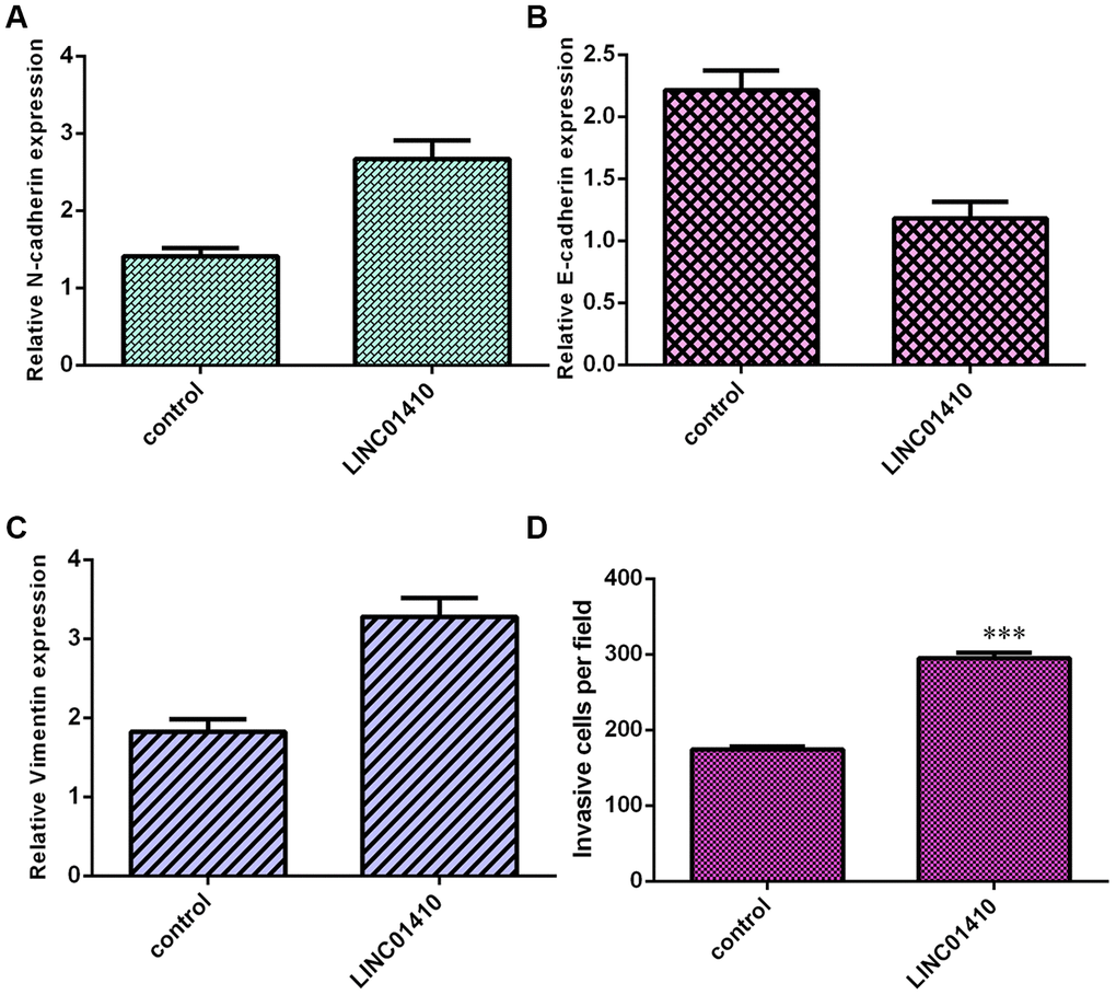 Next, elevated expression of LINC01410 was found to induce N-cadherin expression in MG-63 cells (Figure 4A). LINC01410 overexpression promoted E-cadherin expression in MG-63 cells (Figure 4B). In addition, ectopic expression of LINC01410 promoted Vimentin expression in MG-63 cells (Figure 4C). Elevated expression of LINC01410 increased invasion in MG-63 cells, and the relative number of invasive cells is shown (Figure 4D).