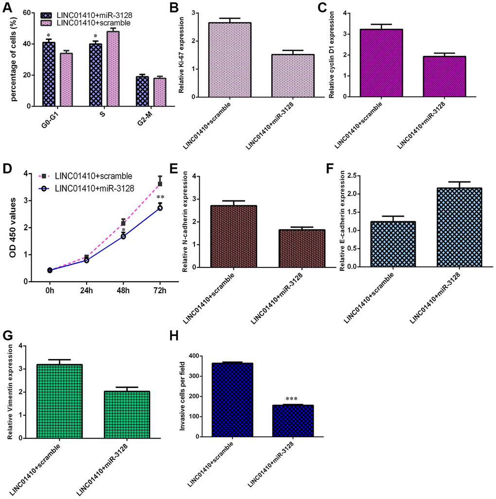 To explore whether LINC01410 plays an oncogenic role in osteosarcoma by regulating miR-3128, we transfected LINC01410-overexpressing MG-63 cells with a miR-3128 mimic. As indicated in Figure 6A, ectopic expression of miR-3128 inhibited the cell cycle in LINC01410-overexpressing MG-63 cells. Elevated expression of miR-3128 suppressed ki-67 (Figure 6B) and cyclin D1 (Figure 6C) in LINC01410-overexpressing MG-63 cells. Overexpression of miR-3128 decreased the proliferation of LINC01410-overexpressing MG-63 cells (Figure 6D). Elevated expression of miR-3128 suppressed N-cadherin (Figure 6E) and Vimentin (Figure 6G) expression and enhanced E-cadherin expression (Figure 6F) in LINC01410-overexpressing MG-63 cells. Finally, miR-3128 overexpression inhibited cell invasion in LINC01410-overexpressing MG-63 cells, and the relative number of invasive cells is shown (Figure 6H).