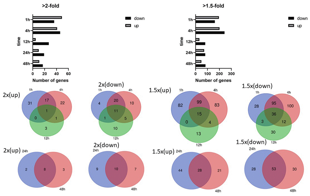 Mechanical stimulation influences cell orientation, which consequently affects cell growth, differentiation, and many cellular functions. The effect of cyclic stretching on gene transcription was determined by stretching AC16 human cardiomyocyte cells by 15% at a frequency of 0.5 Hz for 1, 4, 12, 24, and 48 hours. Among the differentially expressed genes identified in the 1, 4, and 12 hour stretching groups, relatively few that changed at least 2-fold in expression were shared by all three groups (Supplementary Table 2).