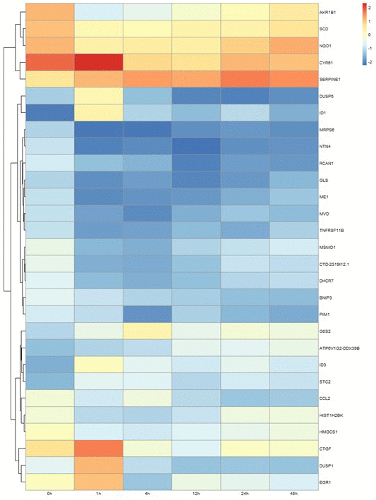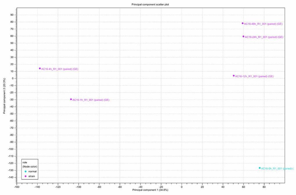 Clustering and principal component analysis are useful techniques for analyzing gene expression data that involve many complex biological networks. Principal component analysis revealed that cells could be separated into groups based on the duration of cyclic mechanical stretching treatment. As shown in Figure 2, principal component analysis revealed that human cardiomyocytes could be separated into long-term (12, 24, and 48 hours) and short-term (1 and 4 hours) stretch effect groups. Gene expression profiles of cells treated with cyclic stretching for 1 and 4 hours had similar metrics which differed from those observed in the static condition (zero hour) group, which was not subjected to any cyclic mechanical stretching treatment (Figure 2).