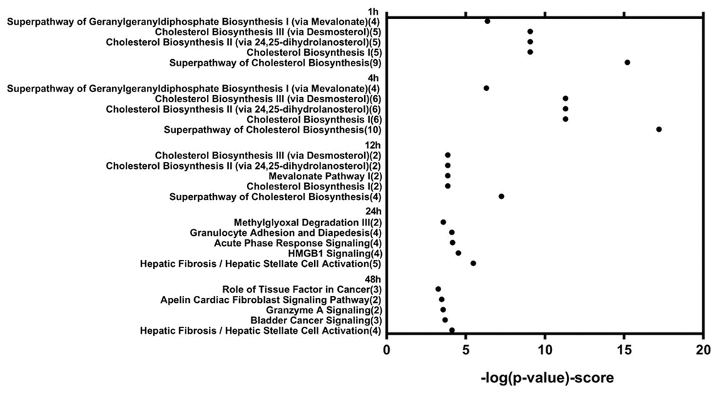 Because ID1 plays roles in cell growth, differentiation, and apoptosis [20, 21], mechanical stretch might also affect these processes by altering its expression. Increases in CYR61 gene expression, which affects cell adhesion and proliferation, after one hour of stretching indicate that it may impact those processes as well. Such increases in anti-apoptotic and pro-survival genes at early time points may help maintain various cellular functions and signaling mechanisms. In contrast, after 24 and 48 hours of mechanical stretching, gene expression increases shifted from the cholesterol biosynthesis pathway to disease pathways, including acute phase response, cancer signaling, and hepatic fibrosis. Furthermore, no significant differences in genes showing differential expression were observed between the 24- and 48-hour mechanical stretching groups, indicating that 24 hours of stretching induced a relatively stable pro-inflammatory response that followed changes to the cholesterol-signaling pathway.
