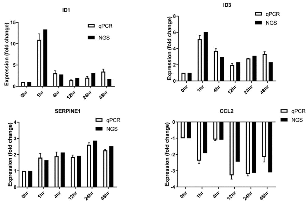 The differentially expressed genes identified by RNAseq were confirmed by performing quantitative real-time polymerase chain reaction (RT-qPCR) for four selected genes – ID1, ID3, CCL2, and SERPINE1. First, first-strand cDNA was generated from 0.1 μg of RNA using a ProtoScript® II First Strand cDNA Synthesis Kit (New England Biolabs, Inc., USA) in the presence of oligo-dT primers. After cDNA amplification, qPCR reactions were run on an ABI™ StepOne™ Real-Time PCR System (Applied Biosystems, Foster City, CA, USA) with KAPA SYBR® FAST Master Mix (2X) ABI Prism™ (KAPA BIOSYSTEMS, Boston, Massachusetts, United States). Gene expression levels were normalized to the expression of the internal housekeeping gene GAPDH. Relative quantification was calculated using the 2−ΔΔCT method. The sequences of the primers used are listed in Supplementary Table 1.