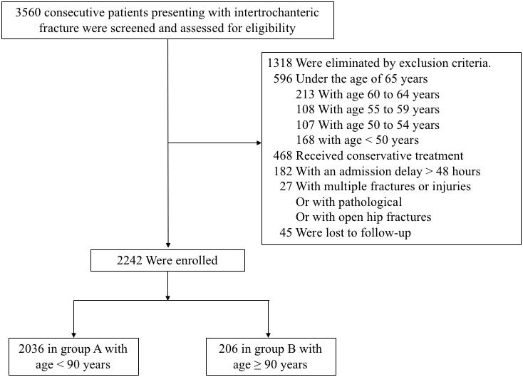 From Jan 2014 to Jan 2019, a total of 3560 consecutive patients presenting with intertrochanteric fracture were screened and assessed for eligibility to participate in this study. A total of 1318 patients were eliminated by the exclusion criteria. Among these, 596 patients were under the age of 65 years (213 with age 60 to 64, 108 with age 55 to 59, 107 with age 50 to 54, 168 with age < 50); 468 patients (46 with age ≥ 90, 422 with age 65-89) received conservative treatment; 182 patients (22 with age ≥ 90, 160 with age 65-89) had an admission delay of more than 48 hours; 27 patients had multiple fractures or injuries, pathological or open hip fractures; and 45 patients were lost to follow-up. Finally, 2242 patients, including 2036 in group A with age < 90 years and 206 in group B with age ≥ 90 years, presenting with intertrochanteric fracture met our inclusion and exclusion criteria (Figure 1).