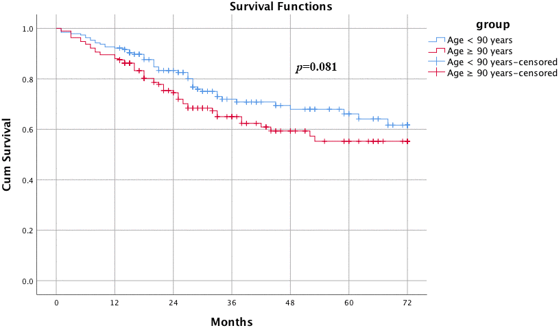 The average follow-up was 37 months. The overall mortality rate of all patients was 20.38% at the end of this study, and deaths occurred predominantly during the first 4 years. The cumulative survival rates of the two groups of patients were gradually decreased within the first three years after injury and stabilized thereafter. Patients older than 90 years had a risk of death at 1 year that was 0.98 times as high, a risk of death at 2 years that was 1.6 times as high, a risk of death at 3 years that was 1.5 times as high and a risk of death at 4 years that was 1.3 times as high as the risk of the patients less than 90 years. However, the Kaplan-Meier survival curve showed no significant difference between the two groups of patients in cumulative survival rate. (Figure 2, p=0.081, log-rank).