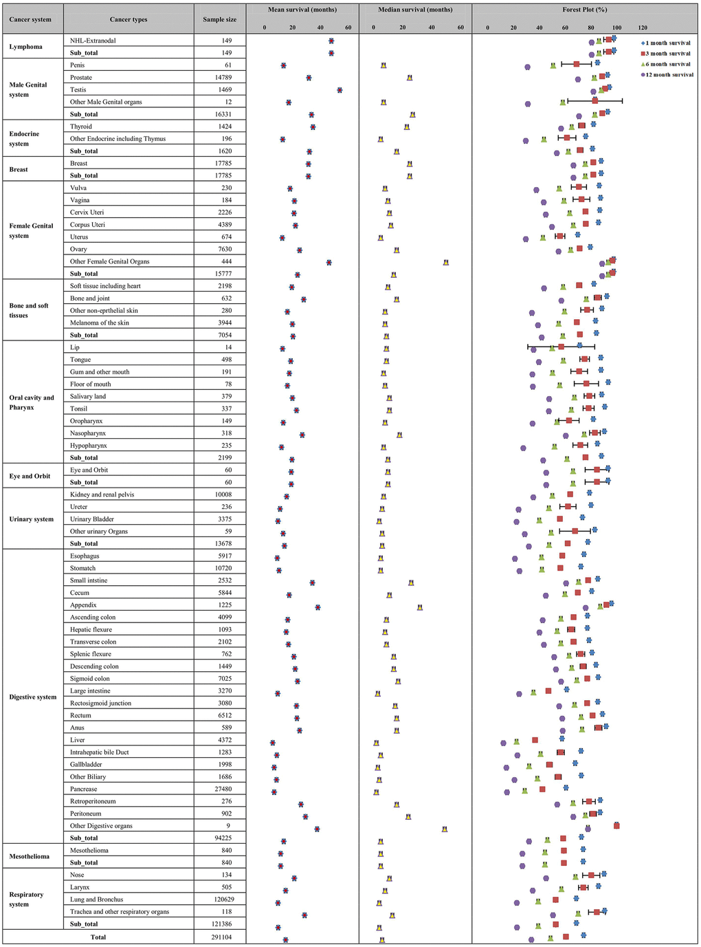 A total of 291,104 metastatic cancer patients with cancer in 61 sites were included in the construction cohort in the present study. In these patients, the mean age was 67.12±13.40 years (0-113 years), 52.6% (N=153,228) were male, and 51.7% were married (N=142,757). Most of the patients were white (N=230,342, 79.3%), and 80.1% of them were insured (N=227,272). The demographic and clinical characteristics stratified by cancer site are described in Figure 1.