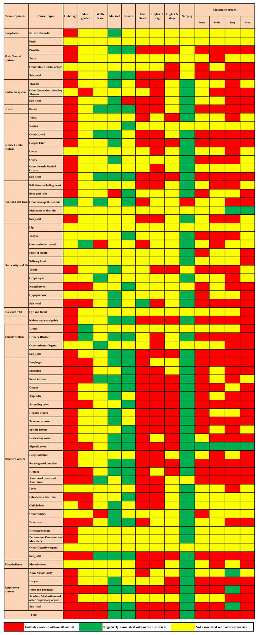 Multivariable Cox regression showed that advanced age, male sex, white race, poorly differentiated grade, higher T stage, higher N stage, and bone, brain, lung, and liver metastases were all positively associated with overall mortality. Married status, insured status, and surgery at the primary site were all negatively related to overall mortality. The associations between the factors mentioned above and overall survival were not consistent across cancer in different systems and cancer types. These factors were all associated with metastatic lung and bronchus cancer; however, metastatic cancers of other digestive organs and the penis were not associated with any of these factors. Even in the same system, the factors associated with metastatic cancer in different sites were not consistent (Figure 3).