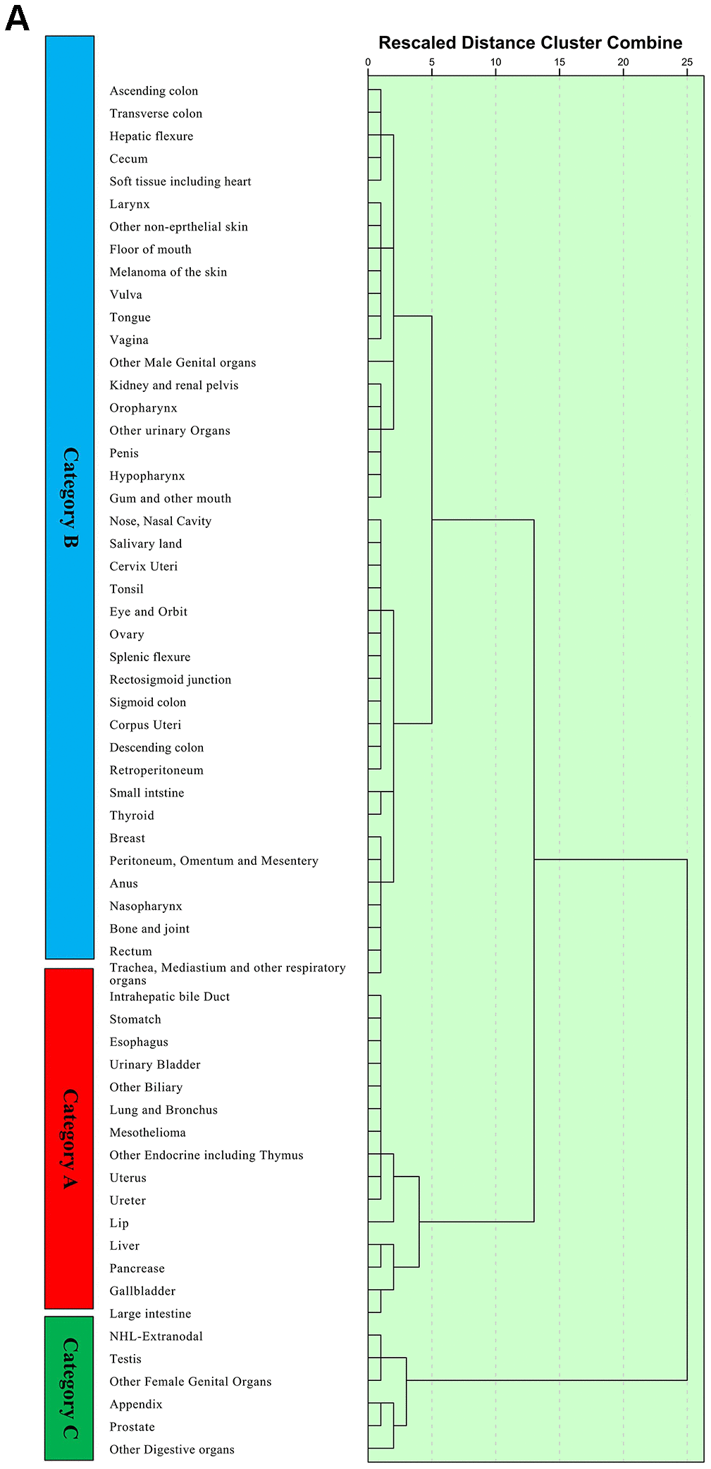 Unsupervised hierarchical clustering analysis was used to classify the 61 cancer sites into three main subgroups, namely, categories A, B, and C. The category A metastatic cancer subgroup had the worst prognosis and included intrahepatic bile duct cancer, stomach cancer, oesophageal cancer, urinary bladder cancer, other biliary cancer, lung and bronchus cancer, mesothelioma, another endocrine including thymus cancer, uterus cancer, ureter cancer, lip cancer, liver cancer, pancreatic cancer, gallbladder cancer, and large intestine cancer (Figure 4A). With the best prognosis, the category C metastatic cancer subgroup included metastatic NHL-extranodal cancer, testis cancer, other female genital organ cancer, appendix cancer, prostate cancer, and other digestive organ cancers. Details about the categories across different anatomical systems are provided in the Supplementary Table 1.