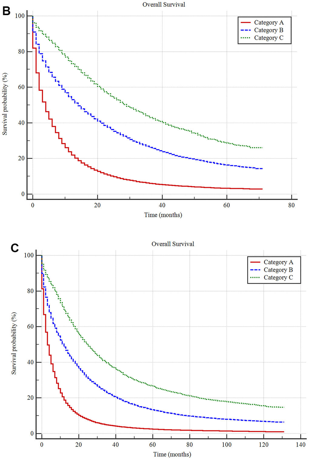 For the validation cohort in the SEER database, the mean survival times in the A, B, and C metastatic cancer subgroups were 9.47±0.05 months (median survival 4.00±0.02 months), 27.22±0.13 months (median survival 12.00±0.10 months) and 44.55±0.38 months (median survival 26.00±0.37 months), respectively. There was a significant difference among the three categories (P <0.001) (Figure 4C).