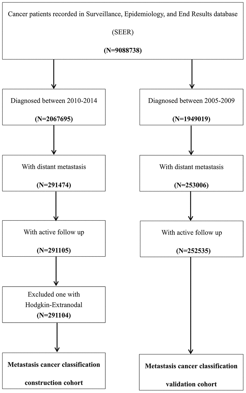 This study used a metastatic cancer case cohort derived from the National Cancer Institute SEER cohort. The SEER database covers approximately 30% of the total United States population. Patients with metastatic cancer according to the American Joint Committee on Cancer (AJCC) staging system, 7th edition, who were diagnosed between 2010 and 2014 were included as the construction cohort in the present study. Patients with metastatic cancer who were diagnosed between 2005 and 2009 in the SEER cohort were included as the validation cohort. Patients who were diagnosed by death certificate or autopsy were excluded. SEER*Stat Software version 8.3.5 (https://seer.cancer.gov/seerstat/) (Information Management Service, Inc., Calverton, MD, USA) was used to generate the case list (Figure 5).