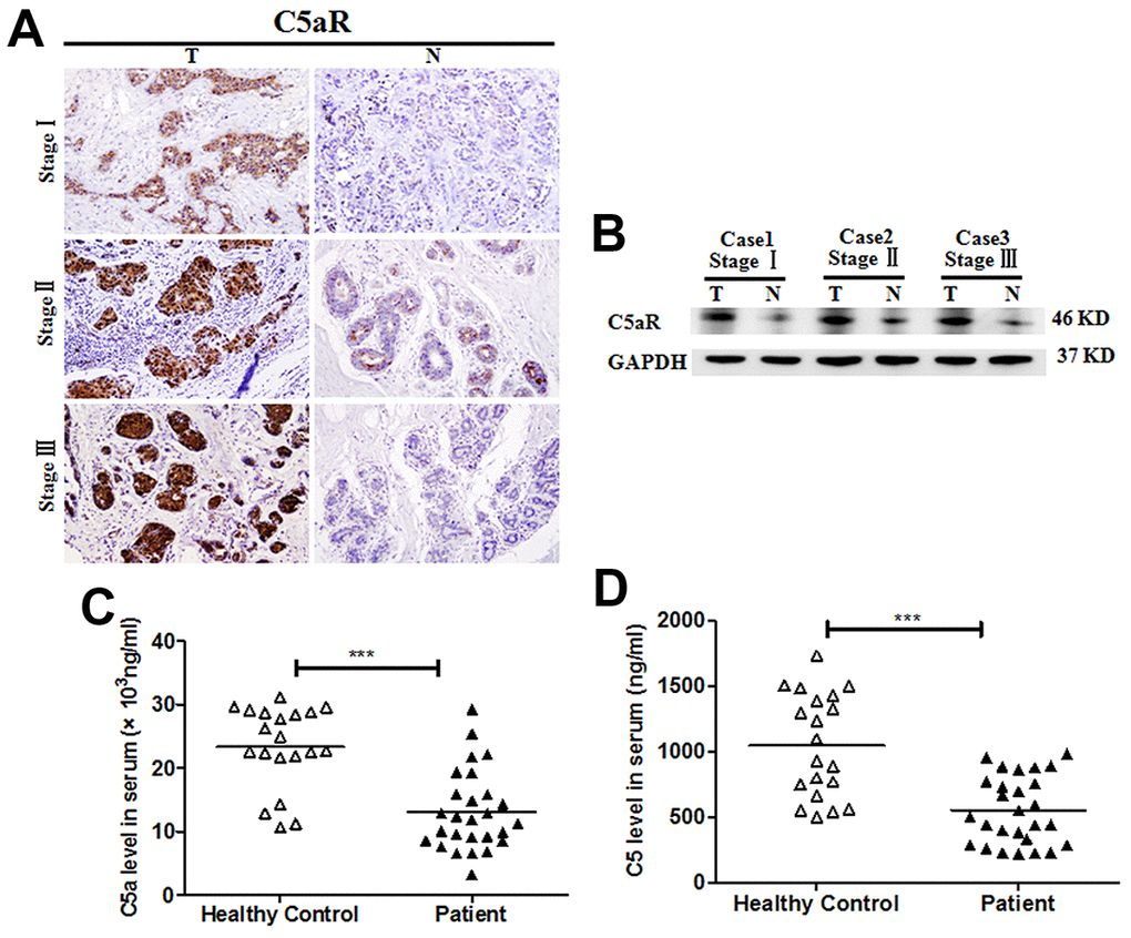 To investigate the potential role of the C5a/C5aR pathway in BC, we analyzed C5aR expression in the tumoral tissues from BC patients at different clinical stages using IHC and western blotting. C5aR expression was significantly higher in the tumoral tissues than in the BC-adjacent non-tumoral tissues (Figure 1A, 1B). However, the C5a and C5 serum levels of patients with BC (n=27) exhibited a remarkable reduction, compared to healthy volunteers (n=20) (C5a: P<0.001, Figure 1C; C5: P<0.001, Figure 1D). The drop in serum C5a and C5 levels detected in the advanced BC patients was possibly due to the excessive activation and consumption of the complement in the early stages.