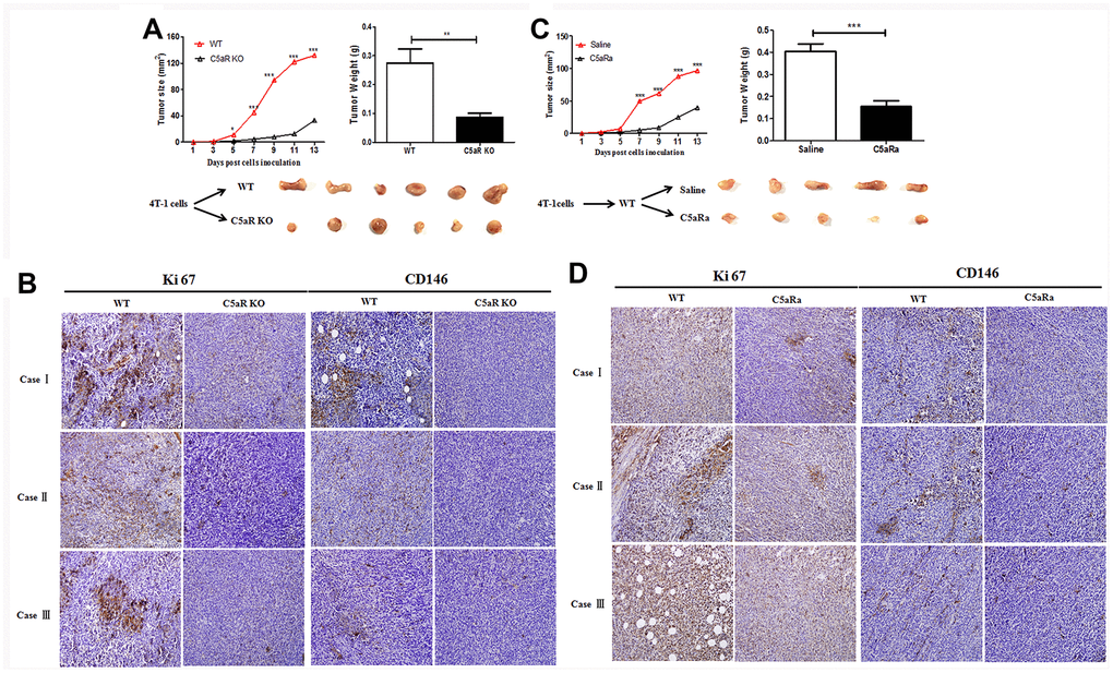 To verify the effects of the C5aR signaling on BC development in vivo, mice were transplanted with the BC cell line 4T-1 cells (C5aR positive) (Supplementary Figure 1). C5aR deficiency caused a significant reduction in the tumor growth (Figure 2A). Moreover, the expression of Ki67 and CD146, which are closely related to the cell proliferation and angiogenesis, was remarkably downregulated in C5aR deficient mice (Figure 2B). Similar results were found when the mice were treated with the C5aRa (Figure 2C, 2D), a C5aR antagonist hexapeptide AcF (OP (D) ChaWR) [22]. In addition, the senescence of 4T-1 cells in vitro was significantly increased after C5aRa treatment (Supplementary Figure 2) while the invasion and metastasis of a non-adherent BC cell line MDA-MB-453 cells were accelerated after exposure to recombinant C5a (Supplementary Figure 3). All these results indicate the critical role of C5a/C5aR pathway in the pathogenesis of BC development.