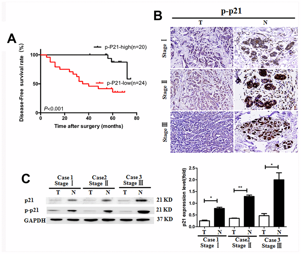 It was previously reported that the p21 expression was negatively correlated with tumor development in colorectal cancer and gastric carcinoma [23, 24]. However, the role of p21 in the pathogenesis of BC is unclear. In the present study, we found high expression of p-p21 was significantly associated with less lymph node metastasis and early TNM stage (Table 1, p=0.016 and 0.042 respectively). Kaplan-Meier analysis was used to analyze the effect of p-p21 on the survival of BC patients. We showed that the patients with low p-p21 expression had a significantly (p<0.001) shorter disease-free survival (DFS) than those with higher p-p21 expression (Figure 3A). Additionally, multivariate analysis indicated that p-p21 expression was an independent prognostic factor for DFS in the patients (Table 2). Consistent with these results, lower p21 and p-p21 expression was found in the tumoral tissues than in the non-tumoral tissues in BC patients (Figure 3B, 3C), suggesting that p21/p-p21 plays a protective role during the development of BC.