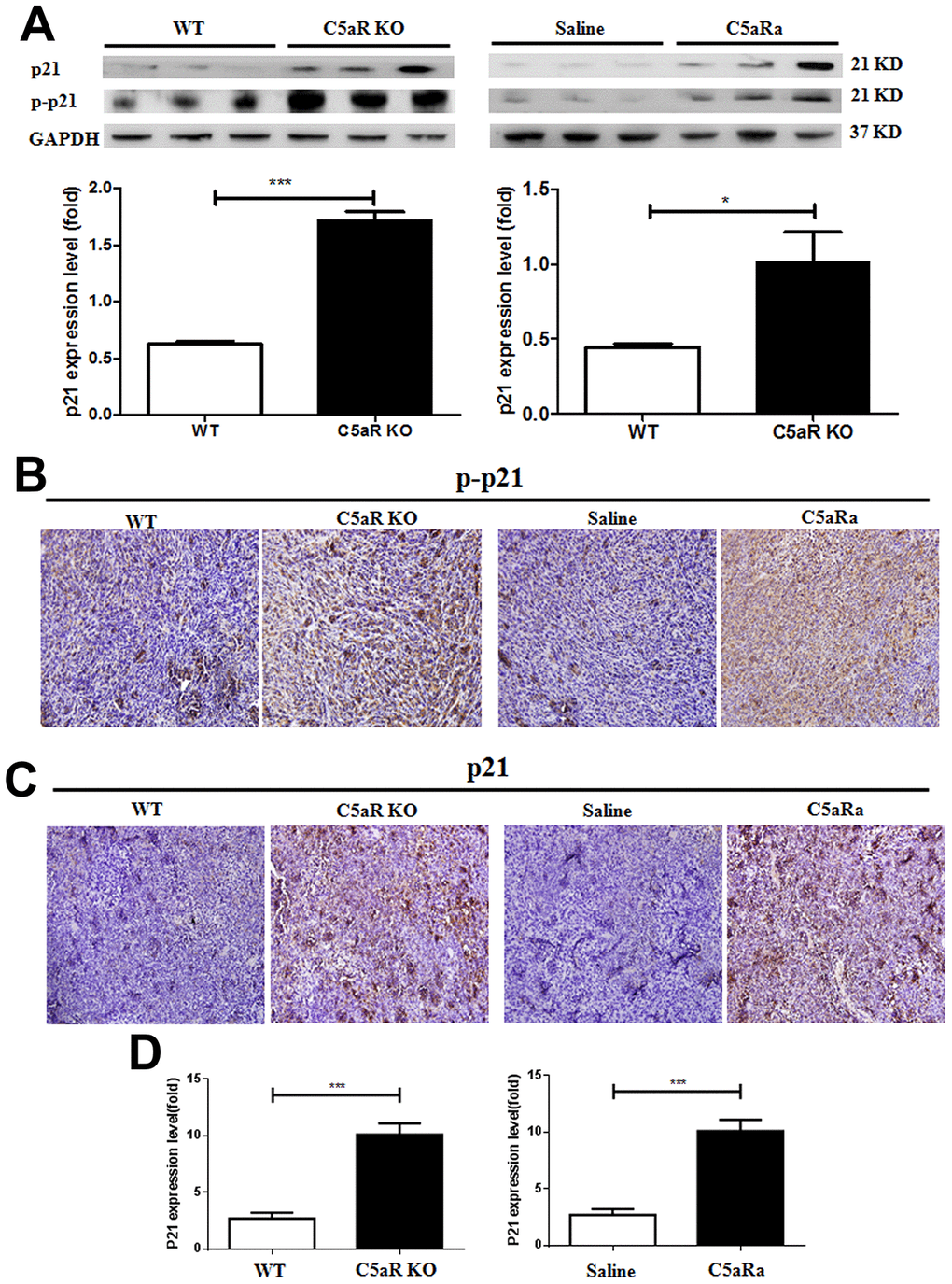 To investigate the correlation of the C5a/C5aR pathway with p21 expression during BC development, WT and C5aR knock-out mice were transplanted with the BC cell line, 4T-1 cells (p21 positive) (Supplementary Figure 4). The expression of p21 and p-p21 were measured by western blotting, IHC and RT-PCR. The increased expression of the p21 and p-p21 was observed in tumor tissues of mice with C5aR-deficiency or treated with C5aRa (Figure 4A–4D). This suggests that the C5a/C5aR signaling is critical for the reduction of p21 expression during the development of BC.