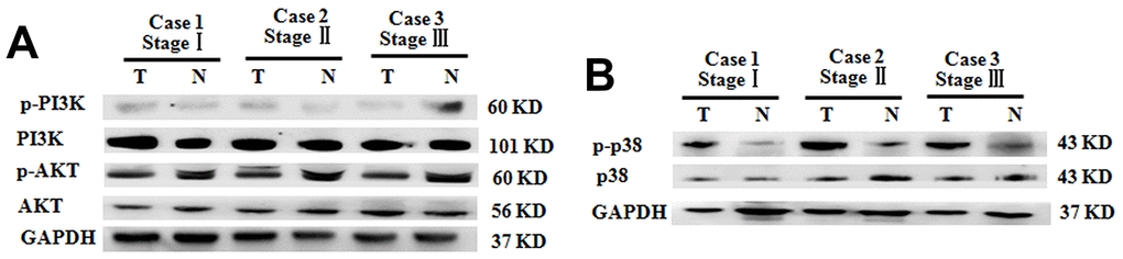 Although the PI3K/AKT signaling pathway was closely related to the genesis and metastasis of some types of tumors, such as colorectal cancer and hepatocellular carcinoma [25, 26], the levels of PI3K/AKT were comparable between the tumoral tissues and para-carcinoma tissue from BC patients with clinical stages (Figure 5A). This is indicative of the non-association of the PI3K/AKT pathway and pathogenesis of BC. In contrast, compared with that in para-carcinoma tissue, the p-p38 levels in the tumoral tissues were significantly increased (Figure 5B).