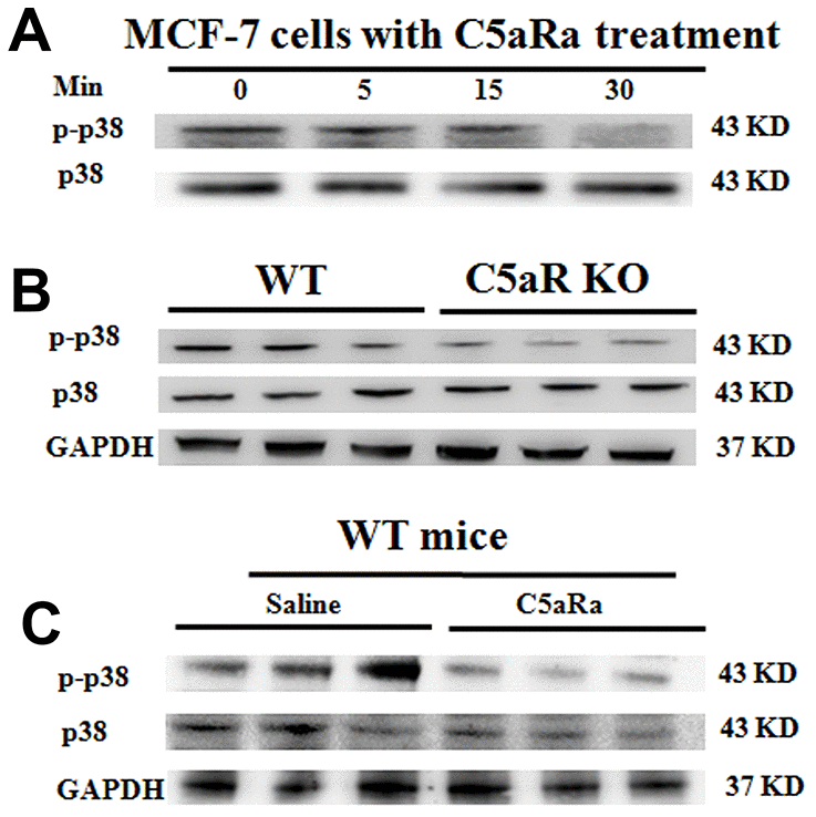 To explore the correlation of C5aR signaling with MAPK/p38 pathway activation during BC growth, we treated BC cell line MCF7 cells (which constitutively expressed p21 (Supplementary Figure 4) and C5aR (Supplementary Figure 5A) ) with the C5aRa for 24 h. It was found that p38 phosphorylation levels showed a time-dependent reduction (Figure 6A) as well as cell proliferation was suppressed (Supplementary Figure 5B) and the cells underwent a p21-mediated G2/M phase arrest with a concentration-dependent manner (Supplementary Figure 5C). When mice were transplanted with the BC cell line 4T-1 cells, mice with the C5aR-deficiency or treated with C5aRa exhibited a remarkable decrease in p-p38 levels during the development of BC (Figure 6B, 6C). Taken together, these in vitro and in vivo results demonstrate that the C5a/C5aR pathway participates in the MAPK/p38 pathway activation during BC development.