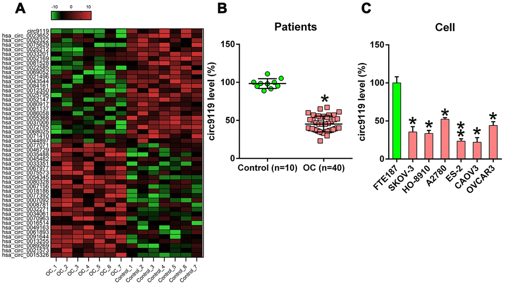 Among them, circ9119 displayed the most significant change in expression. Further, the qRT–PCR results of circRNA expression assessed in 40 OC samples and 10 control samples showed that compared with the control samples, the OC tissues exhibited a remarkable decrease in circ9119 expression (Figure 1B). Furthermore, all the six OC cell lines displayed reduced circ9119 expression compared with FTE187 (Figure 1C).