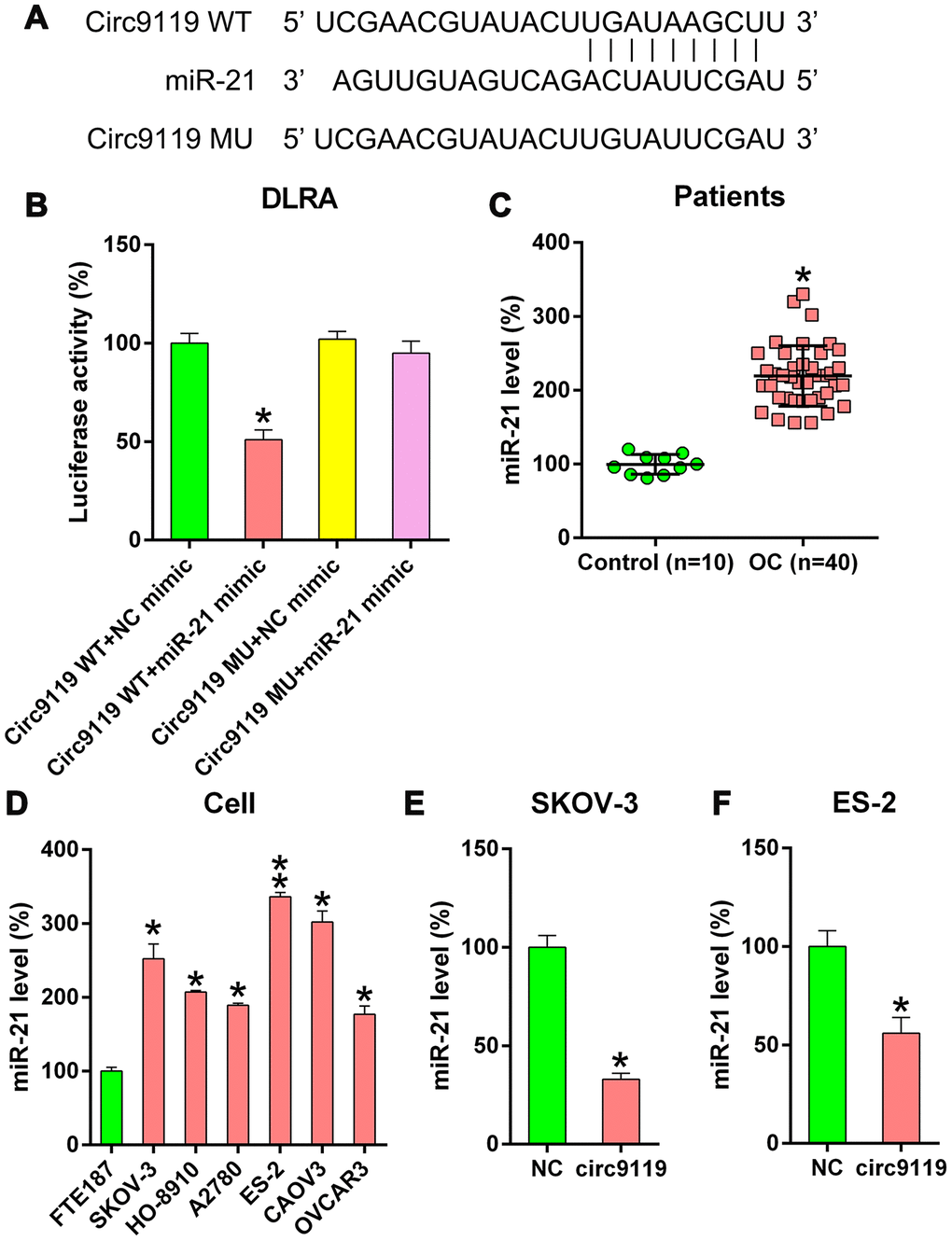Previous studies have reported the oncogenic role of miR-21 in OC and several other types of cancers [7–9]. In the present study, bioinformatics forecasting tools indicated that circ9119 gene covered the miR-21 seed region-complementary presumptive binding sites (Figure 4A). DLRA was then used to confirm the direct association between miR-21 and circ9119 (Figure 4B). Luciferase activity was found to be reduced by 50% in the HEK293T cells that were cotransfected with WT circ9119 and miR-21 mimic.