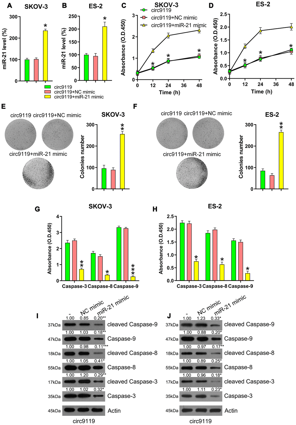 Several studies have demonstrated that miR-21 can suppress apoptosis in various cancers [10]. Therefore, we hypothesized that miR-21 is involved in the circ9119-mediated proliferation of OC cells. To elaborate the role of miR-21 in cell proliferation, the cells were subjected to cotransfection with a circ9119 overexpressing or NC vector and an miR-21 or NC mimic. qRT–PCR data first demonstrated that miR-21 expression was significantly increased in the circ9119 overexpressing transfection group compared with that in the NC mimic transfection groups (Figure 5A, 5B). The MTT and colony formation assays demonstrated that miR-21 mimics restored the viability and proliferation of circ9119-overexpressing OC cells (Figure 5C–5F). Moreover, caspase activity assay and western blotting showed that miR-21 upregulation caused an obvious decrease in the activities, expression, and cleavage of the caspases, counteracting the effects of circ9119 (Figure 5G–5J). Thus, these data suggest that circ9119 influenced cell viability and apoptosis via miR-21 regulation.