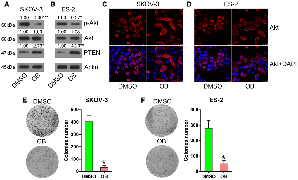 To confirm the effects of PTEN on the viability of SKOV-3 and ES-2 cells, these cells were incubated with 5 μM OB (PTEN agonist) or 1% dimethyl sulfoxide (DMSO) for 12 h. Thereafter, the colony formation assay was performed. First, we confirmed the upregulation of PTEN expression after OB treatment and then found that OB treatment inhibited the downstream expression and phosphorylation of Akt was inhibited in the SKOV-3 and ES-2 cells (Figure 7A, 7B). In addition, we observed that the nuclear location of Akt was transported into the cytoplasm on OB incubation (Figure 7C, 7D), indicating that the PTEN pathway was upregulated by OB to block Akt activation. Finally, the colony formation assay showed that OB treatment reduced the number of colonies formed by SKOV-3 and ES-2 cells (Figure 7E, 7F). These data show that OB impaired the growth of OC cells and that PTEN served as a tumor suppressor in OC.