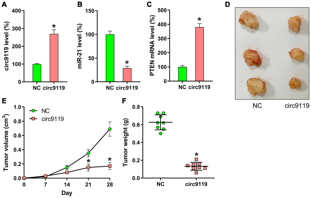 To determine the effects of circ9119 on tumor growth in an in vivo xenograft tumor model, SKOV-3 cells with stably expressing circ9119 or NC were subcutaneously injected into nude mice. The mice were euthanized at 30 days following injection, and their tumors were removed and weighed. circ9119, miR-21, and PTEN mRNA expression in tumors was compared in the two groups (circ9119 group and NC group) at 30 days following injection. Upregulation of circ9119 and PTEN mRNA, and miR-21 downregulation were confirmed in the circ9119 group by qRT–PCR (Figure 8A–8C). The results indicated average volume and weight of the tumors: the circ9119-expressing tumors developed at a much slower rate than the tumors of the mice from the NC group, and the average tumor volume and weight was remarkably lower than those of the tumors in the mice from the NC group at day 28 post injection (Figure 8D–8F).