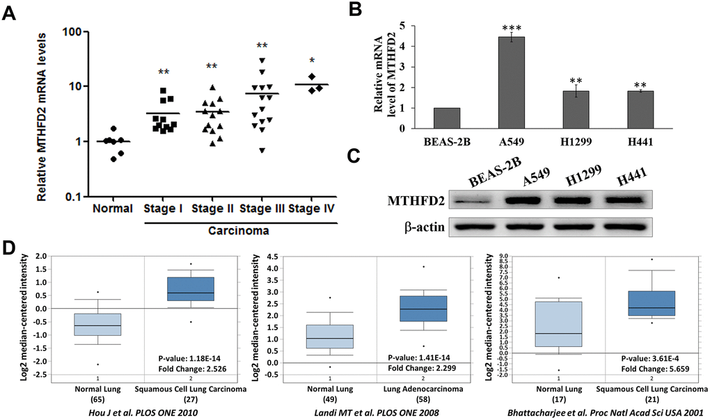 Cancers are presumed to proceed successively from less to more advanced preclinical phases. Additionally, their stage-specific correlation with metabolic gene MTHFD2 mediating mitochondrial folate pathway is still unknown. Our data showed a significantly increased expression profile of MTHFD2 mRNA in all stages of LCa tissue compared to normal with increasing tendency (Figure 1A). Similar results were evident in mRNA (Figure 1B) and protein (Figure 1C) levels in three human LCa cell lines A549, H1299 and H441 compared with normal lung epithelial cell line. These outcomes were further corroborated using OncomineTM Database in three previous studies [19–21], showing highly significant expression (over 2-fold) of MTHFD2 in LCa compared to normal counterparts (Figure 1D). A similar trend of MTHFD2 expression profiles was also observed in The Cancer Genome Atlas (TCGA) and genotype-tissue expression (GTEx) projects using GEPIA2 online platform (http://gepia2.cancer-pku.cn/#index) (Supplementary Figure 1), which further validates expression levels.