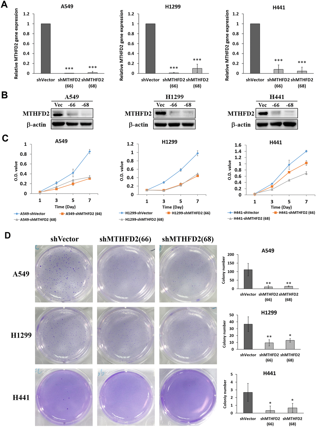 Mitochondrial folate-coupled metabolism is thought to be central in proliferative cancer [22]. Hence, we investigated the role of MTHFD2 in LCa growth and proliferation by establishing vector control and MTHFD2-knockdown cell lines of A549, H1299 and H441 through lentiviral transduction. The efficiency of these cells lines was examined by detecting GFP expression through flow cytometry (Supplementary Figure 2), and the influence of lentiviral transduction to the cell viability was evaluated through MTT assay (Supplementary Figure 3). Our results confirmed gene (Figure 2A) and protein (Figure 2B) levels of expressed MTHFD2, showing clearly established cell lines. Further, MTT assay demonstrated significantly inhibited proliferation ability of MTHFD2-knockdown cell lines (Figure 2C). Eventually, soft agar exhibited significantly decreased number of colonies in all the MTHFD2-knockdown cell lines (Figure 2D), indicating the role of MTHFD2 in malignant transformed cells. However, the cytometric analysis of apoptosis showed that compared to vector control, no significant increase in apoptotic population in early (Q4) as well as late (Q2) phase of MTHFD2-knockdown cell lines was observed (Supplementary Figure 4). This indicate that MTHFD2 knockdown may not directly cause significant cell apoptosis, but might decelerate cell growth ability, which also corresponds to our results of MTT assay and soft agar assay.