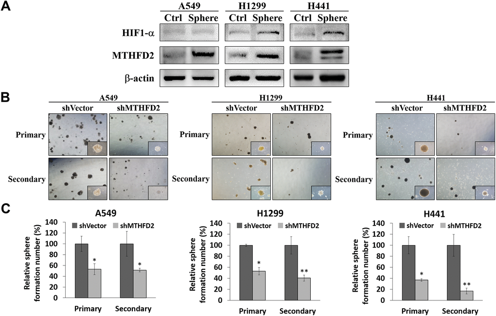 To deduce the relation between MTHFD2 and LCa cell stemness, we conducted sphere formation assay, which is widely used to identify stem cells based on their self-renewal and differentiation potential [23]. Our results showed significantly up-regulated protein expressions of both MTHFD2 as well as HIF-1α in parental A549, H1299 and H441 sphere-forming cells compared to counterparts (Figure 3A), implying that LCa stemness might be attributed to increased MTHFD2 expression, possibly through inducing elevated levels of HIF-1α under low oxygen tension.