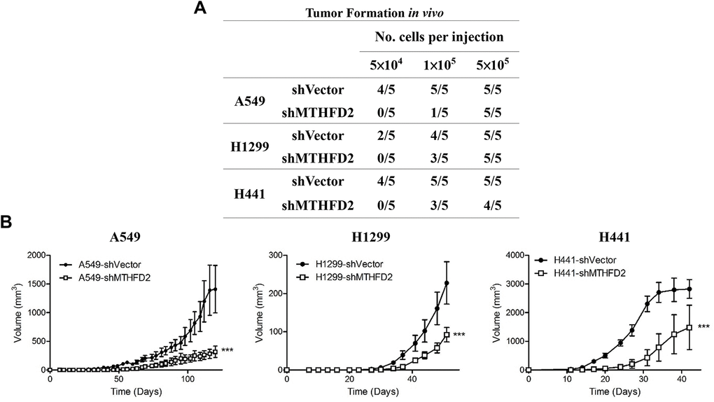 All the animal studies were approved by Institutional Animal Care and Use Committee (IACUC) of Taipei Medical University Taiwan (Approval No. LAC-2016-0526). In our study, 6-weeks old non-obese diabetic/severe combined immunodeficiency (NOD/SCID) mice were used for in vivo limiting dilution transplantation assay. Mice were anesthetized by mixture of 10X dilution of Zoletil 50 (Virbac, Carros, France) and 10X dilution of Rompun (Bayer, Korea). Both vector control groups and MTHFD2-knockdown groups of A549, H1299 and H441 cells were subcutaneously injected with three different dilutions of cell concentration into the flank of right leg (n=5). The injected cell number of each line were 5×105, 1×105 and 5×104. Tumor size was measured with digital caliper twice a week, and was calculated using following formula: