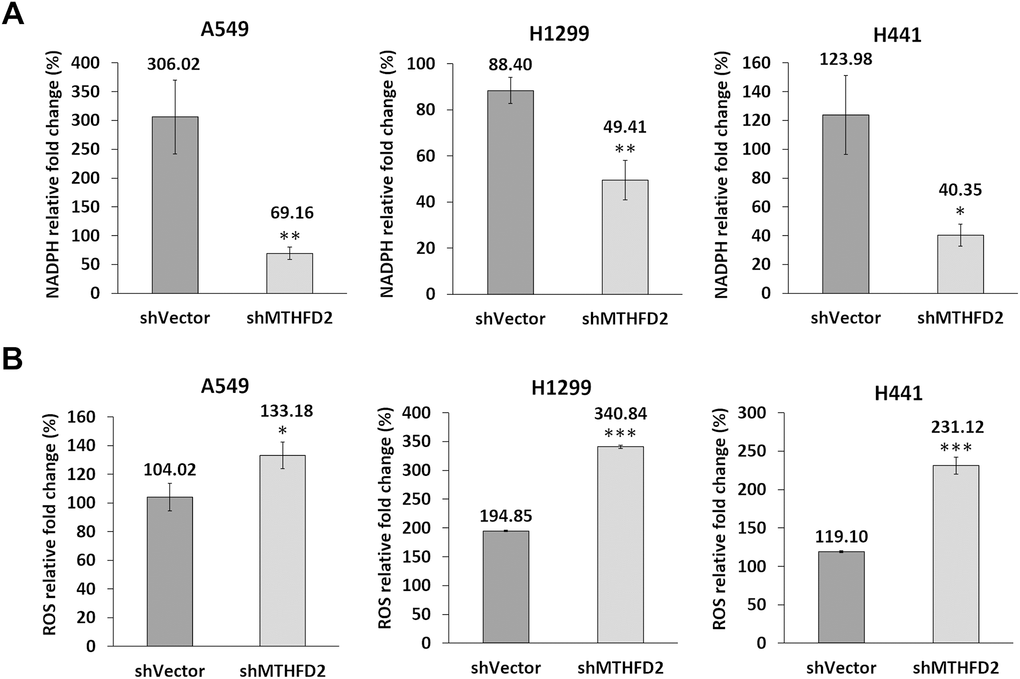 To investigate the MTHFD2-mediated redox homeostasis under low oxygen tension, we determined the levels of NADPH and ROS after treating vector control and MTHFD2-knockdown groups with CoCl2. The vector control groups revealed significantly higher expression of NADPH (Figure 6A); whereas ROS level was significantly increased in MTHFD2-knockdown groups (Figure 6B). These results imply that MTHFD2 might contribute in maintaining cellular redox homeostasis under low oxygen tension, knockdown of which led to accumulated ROS levels, resulting into inhibited LCa phenotype.