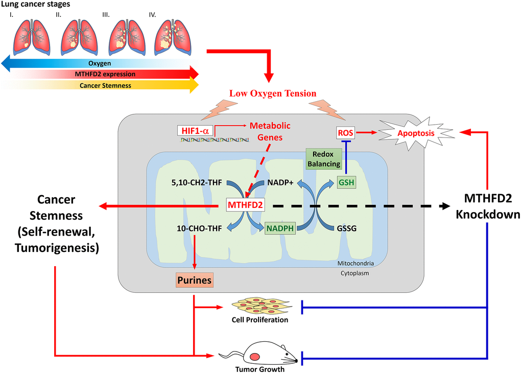 It has been further reported that mammalian cells under acute exposure of hypoxic conditions (1% O2) leads to increased ROS generation at ETC complex III [40]. This imply that low oxygen availability can increase mitochondrial ROS generation, indicating most efficient ETC functions under normoxic conditions. In rapidly growing cancer cells, the surrounding vasculature becomes inadequate with depleted oxygen levels in tissues; as a results, cytochrome oxidase consumes nearly all available oxygen rendering non-mitochondrial compartments essentially anoxic leading to decreased hydroxylase activity [41], and induces stabilization and transcriptional activation of HIF-1α protein, the regulatory member of HIF-1 complex. This HIF then promotes the synthesis of cellular vesicles which facilitates intercellular communication in form of angiogenesis. These evidences infer that decreased cellular oxygen sensing potential in presence of cobalt chloride led to elevated levels of MTHFD2 and highly formed tumors in vector group. It has been suggested that supply of NADPH for anabolic processes might be the rate-limiting step for proliferation of cancerous cells [14, 42, 43]. This was also validated in our results demonstrating suppressed levels of NADPH in MTHFD2-knockdown cancer cell lines. This reduced NADPH supply further led to oxidative stress management in these cancer cells, in terms of increased ROS and cellular apoptosis. Taken together, our data demonstrated that MTHFD2 is significantly associated with LCa and mediates in cancer growth and proliferation, stemness, cellular metabolic reprogramming-dependent tumor aggressiveness, oxygen sensing and oxidative stress response. Eventually, we revealed that MTHFD2 knockdown displays therapeutic activity against LCa (Figure 7), and warrants further clinical investigation.