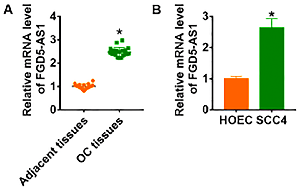 We firstly examined the expression of lncRNA FGD5-AS1 in OC clinical samples. In 20 samples of patients diagnosed with OC, FGD5-AS1 was highly expressed in OC cancer compared with adjacent tissues (Figure 1A). In addition, we cultured OC cell line SCC4 and normal human oral epithelium HOEC. QRT-PCR analysis showed that the level of FGD5-AS1 was dramatically higher in SCC4 than that in HOEC (Figure 1B).