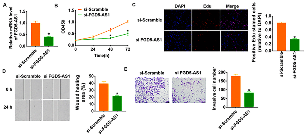 To further identify the function of FGD5-AS1 in OC progression, we constructed siRNA of FGD5-AS1. As shown in Figure 2A, transfection of si-FGD5-AS1 significantly suppressed the expression of FGD5-AS1 in SCC4 cells as compared to cells transfected with scrambled siRNA. CCK-8 experiment was performed to detect the proliferation ability in SCC4 after FGD5-AS1 siRNAs transfection. The results showed that loss of FGD5-AS1 significantly inhibited growth rate of SCC4 cells at 48 h and 72 h than cells transfected with scrambled siRNA (Figure 2B). Edu analysis was performed to examine cell proliferative potential, which showed that knockdown of FGD5-AS1 decreased Edu positive cell numbers (Figure 2C). Migration and invasion are the key processes for cancer progression, we then tested the role of FGD5-AS1 on migration and invasion ability in SCC4 cells. The wound healing suggested that silencing FGD5-AS1 decreased the wound healing area, which exhibited a lower migratory ability in si-FGD5-AS1 transfected cells (Figure 2D). Transwell assay was used to test invasive ability. The results showed that si-FGD5-AS1 significantly reduced the cell invasive ability in SCC4 cells (Figure 2E).