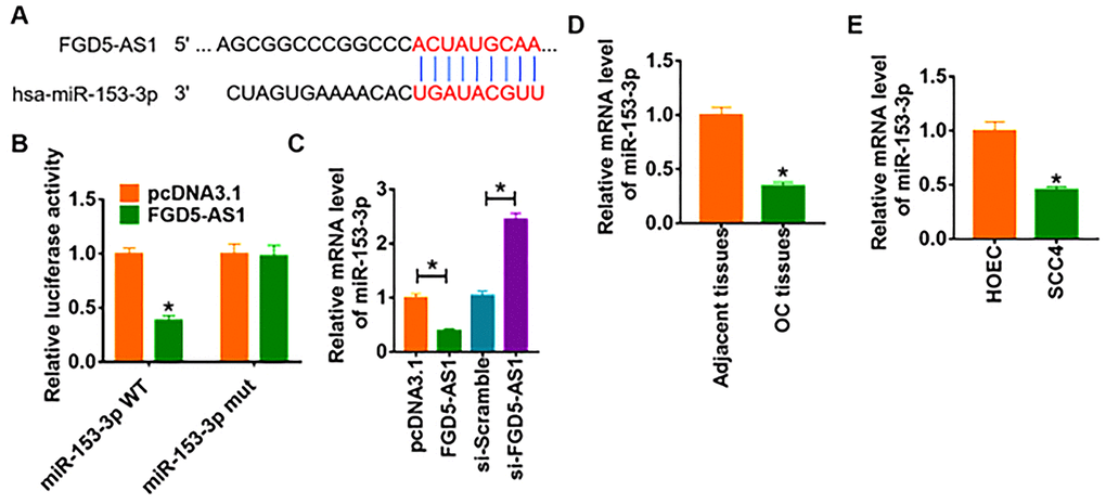 We used miRanda database to identify miRNA with FGD5-AS1 biding sites, which showed a binding between miR-153-3p and FGD5-AS1 (Figure 3A). To further clarify the relationship between FGD5-AS1 and miR-153-3p, we performed dual-luciferase reporter assay in HEK293 cell line, and found that the luciferase activity of WT 3’UTR of miR-153-3p was significantly repressed in the FGD5-AS1 compared with pcDNA3.1. However, FGD5-AS1 had no effect on the luciferase activity of mutant miR-153-3p (Figure 3B). Furthermore, qRT-PCR analysis showed overexpression of FGD5-AS1 significantly inhibited miR-153-3p level, while si-FGD5-AS1 promoted miR-153-3p expression (Figure 3C). In addition, we detected miR-153-3p expression in clinical OC tissues and cells. As expected, the protein level of miR-153-3p significantly decreased in OC tissue and SCC4 cells (Figure 3D and 3E).