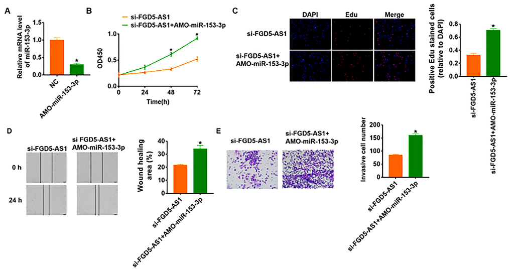 In order to verify whether miR-153-3p is the downstream molecule of FGD5-AS1 regulating OC, we transfected AMO-miR-153-3p in SCC4 cells to inhibit miR-153-3p expression (Figure 4A). And the followed functional experiments showed that loss of miR-153-3p removed the inhibitory effect of FGD5-AS1 on cell viability, proliferation, migration and invasion (Figure 4B–4E), which indicated that si-FGD5-AS1 inhibited OC progression through promoting miR-153-3p.
