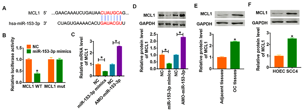 To further clarify the downstream mechanism of miR-153-3p regulating OC, we used Targetscan to predict the potential target. And we found that the 3’UTR of MCL1 possessed directed target site for miR-153-3p (Figure 5A). To investigate whether miR-153-3p directly targeted on MCL1, we constructed dual-luciferase reporter plasmid of WT and mutant MCL1. And we found that the luciferase activity of WT 3’UTR of MCL1 was decreased in the miR-153-3p mimic group compared with NC group. However, miR-153-3p had no effect on the luciferase activity of mutant MCL1 (Figure 5B). Furthermore, overexpression of miR-153-3p significantly inhibited both the mRNA and protein expression of MCL1, while AMO-miR-153-3p increased MCL1 level in SCC4 cells (Figure 5C and 5D). What’s more, we detected MCL1 expression in clinical OC tissues and cells, which showed a dramatic increase of MCL1 level in OC tissues and cells (Figure 5E and 5F).
