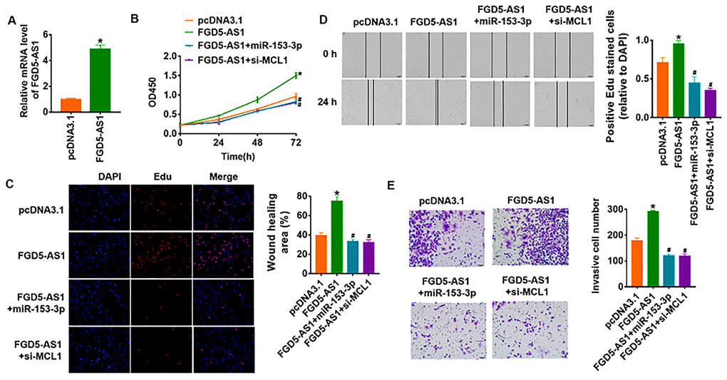 To identify whether FGD5-AS1 promotes OC progression via miR-135-3p/MCL1 axis, we forced expression of FGD5-AS1 in SCC4 cells (Figure 6A). As shown in Figure 6B–6E, overexpression of FGD5-AS1 increased cell viability and promoted cell proliferation, migration and invasion in SCC4 cells. Additionally, overexpression of miR-135-3p or knockdown of MCL1 reversed the pro-tumor effect of FGD5-AS1 (Figure 6B–6E). Taken together, FGD5-AS1 regulated the progression of OC via controlling miR-135-3p/MCL1 axis.