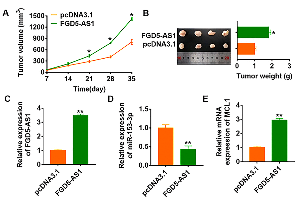 To further explore the function of FGD5-AS1 in OC, we set up xenograft nude mice model. 30 mice were divided into two groups randomly, SCC4 cells were subcutaneously injected into nude mice. 1 week later, we injected lentivirus packaged FGD5-AS1 or pcDNA3.1 into tumors, and we measured tumor volume. The mice with FGD5-AS1 showed a bigger tumor volume, and tumors grew faster (Figure 7A). The tumors were isolated at 30 days after injection, FGD5-AS1 significantly increased tumors weight (Figure 7B). In addition, we isolated these tumor tissues and found that FGD5-AS1 was increased in lentivirus packaged FGD5-AS1 injection tumors (Figure 7C). Moreover, FGD5-AS1 decreased the mRNA level of miR-153-3p and increased MCL1 expression (Figure 7D and 7E).