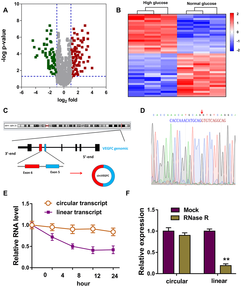 To unveil the expression profile of circRNA in the HG or NG induced HUVECs, circRNA microarray analysis was performed. Volcano plot revealed the up-regulated circRNAs (red) and down-regulated circRNAs (green) in the microarray analysis (Figure 1A). Heat map demonstrated the dysregulated circRNAs in the microarray sequencing (Figure 1B). Schematic diagram illustrated the biogenesis of circVEGFC. circVEGFC was generated from the exon-6 and exon-5 of VEGFC gene locus (Figure 1C). The junction sites of circVEGFC was validated using the Sanger sequencing (Figure 1D). RNA stability assay revealed that the circular transcript form of circVEGFC was much more stable than the its linear transcript when treated with actinomycin D, a transcription inhibitor (Figure 1E). Moreover, RT-PCR revealed that linear transcript form of VEGFC was significantly decreased when treated with RNase R, however, the circular transcript form of circVEGFC was stable (Figure 1F). Overall, this evidence concluded that the novel circVEGFC was up-regulated in HG-induced HUVECs.