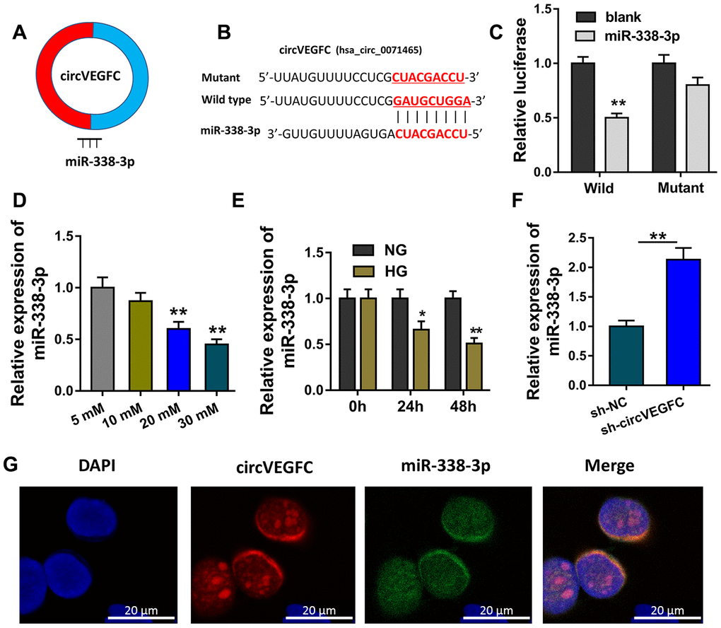 In this research, circular RNA microarray analysis demonstrated the circRNA prolife in the HG-induced and NG-induced HUVECs. Here, circVEGFC (hsa_circ_0071465, splicing length 441 bp) was derived from the VEGFC gene exon-6 and exon-5. In HG-induced HUVECs, circVEGFC knockdown could reduce the apoptosis and promote proliferation through miR-338-3p/HIF-1Α/VEGFA axis. In conclusion, these findings reveal the promotion of circVEGFC/miR-338-3p/HIF-1α/VEGFA axis in the HG-induced ECs’ apoptosis, providing a potential treatment strategy for ECs’ damage in DM.
