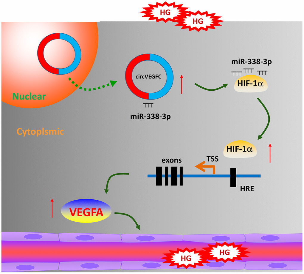 Existing evidence has indicated the close interaction of hyperglycemia and hypoxia in diabetes microenvironment and their lesion to ECs [22]. Hyperglycemia has been identified to regulate the ECs’ proliferation and apoptosis in diabetes [23]. Moreover, HIF-1α is a critical element in the hypoxia environment, both diabetes and tumor vessels, to modulate angiogenesis and hypoxia response [24]. In this research, we found that HIF-1α acted as the target of circVEGFC and miR-338-3p, constructing the circVEGFC/miR-338-3p/HIF-1α axis. These finding inspired us that hyperglycemia might have close connection with hypoxic response. Subsequently, we also found that HIF-1α, a critical transcription factor, target the VEGFA genomic promoter region, being implicated in the angiogenesis stimulating factor. For instance, HIF-1α targets its downstream genes glucose transporter-1 and vascular endothelial growth factor A and induced their mRNA and protein expressions [25].