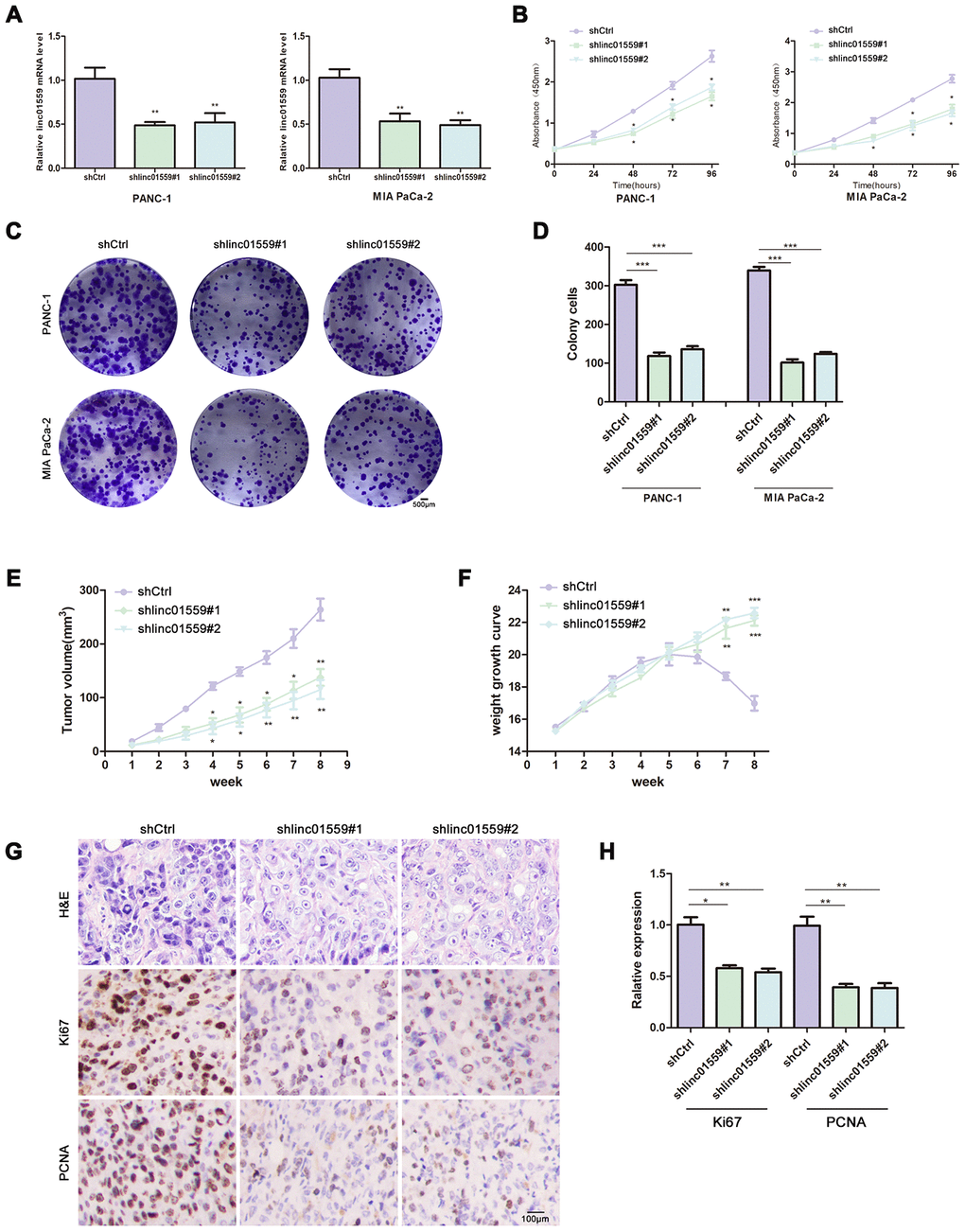 To assess the effect of LINC01559 on proliferative ability, we first designed two different downregulated sequences and cloned them into lentivirus vector. Then, we successfully infected PANC-1 and MIA PaCa-2 PC cell lines with lentivirus vector and compared the effects of transfection with those for control vectors (Figure 2A). CCK-8 assay was carried out to investigate the cell proliferative ability. The results revealed that silencing of LINC01559 expression significantly inhibited cell viability (Figure 2B). In addition, colony formation assay was used to test the colony-forming ability of PC cells. The results illustrated that downregulation of LINC01559 expression suppressed colony formation compared with that in the shCtrl groups (Figure 2C, 2D). To further investigate the role of LINC01559 in PC tumorigenesis, we constructed a subcutaneous tumorigenesis model in vivo. The results from this model suggested that the silencing of LINC01559 expression induced slower growth of tumors and that the tumor volumes were significantly smaller than those in the control group (Figure 2E). Additionally, the mice in the control group began to lose weight after 6 weeks of feeding, possibly as a result of them being more prone to cachexia than the downregulated group (Figure 2F). Proliferation-related indexes Ki67 and PCNA were applied to detect the tumors of mice via IHC. The results proved that Ki67 and PCNA were more highly expressed in the shCtrl groups than in the expression-silenced groups (Figure 2G, 2H).