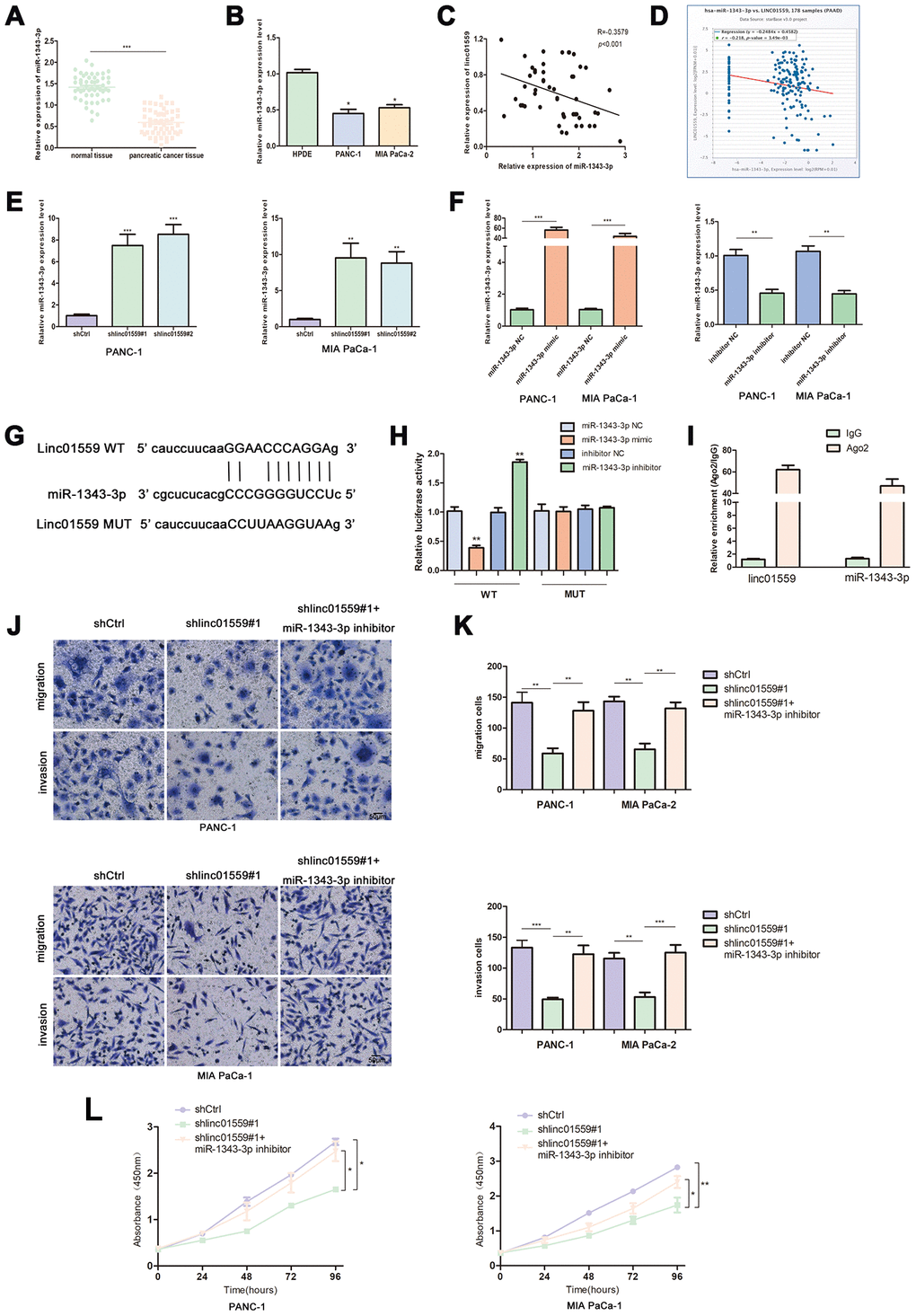 One of the most important mechanisms by which lncRNAs exert their functions is to act as ceRNAs to sponge target miRNAs. Therefore, we searched for and screened potential targets of LINC01559 via a network database analysis in Starbase 3.0. This led to miR-1343-3p being identified as a candidate gene for subsequent validation and research. RT-qPCR was performed to determine the expression patterns of miR-1343-3p; the results revealed that miR-1343-3p was expressed at a low level in PC tissues and cell lines compared with the case in normal tissues and HPDE (Figure 4A, 4B). The results of RT-qPCR analysis revealed that the expression of LINC01559 was negatively correlated with miR-1343-3p expression, which was supported by the results of the bioinformatic database from Starbase 3.0 (Figure 4C, 4D). Subsequently, miR-1343-3p expression in LINC01559-knockdown and control groups was determined by RT-qPCR. The results confirmed that miR-1343-3p was significantly highly expressed in the LINC01559-silenced groups compared with that in the control groups (Figure 4E). To further investigate whether miR-1343-3p was the target of LINC01559, we first transfected miR-1343-3p mimics, inhibitors, and their control into PC cell lines to verify the effects of transfection (Figure 4F). The predicted binding site of miR-1343-3p in the LINC01559 3′UTR is shown in Figure 4G. Luciferase reporter assay confirmed this interaction, showing that LINC01559 wild type expressed lower luciferase activity with miR-1343-3p upregulated and higher luciferase activity with miR-1343-3p inhibition; meanwhile, the LINC01559 mutant exhibited its normal expression (Figure 4H). RIP assay further confirmed the direct interaction between LINC01559 and miR-1343-3p, which were enriched in Ago2 complex (Figure 4I). The experiments on the rescue of cell function indicated that the inhibition of miR-1343-3p expression could partly rescue the inhibitory effects of downregulated LINC01559 on the migration, invasion, and proliferation abilities of PC cells (Figure 4J–4L).