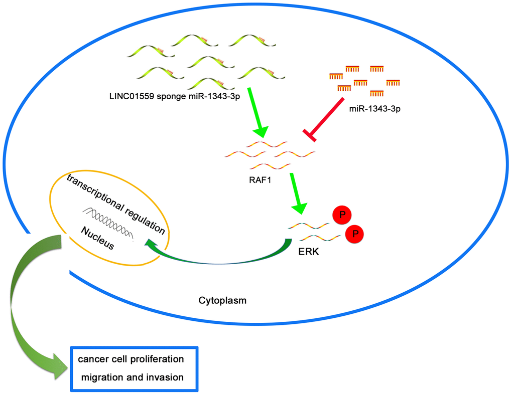 In summary, we identified the oncogenic role of LINC01559 in proliferation and metastasis in PC. Additionally, we revealed that the mechanism underlying this might involve LINC01559 acting as a competing endogenous RNA of miR-1343-3p to up-regulate RAF1 expression, which would further activate the ERK signaling pathway. Therefore, LINC01559 might become a potential diagnostic and therapeutic target in PC.