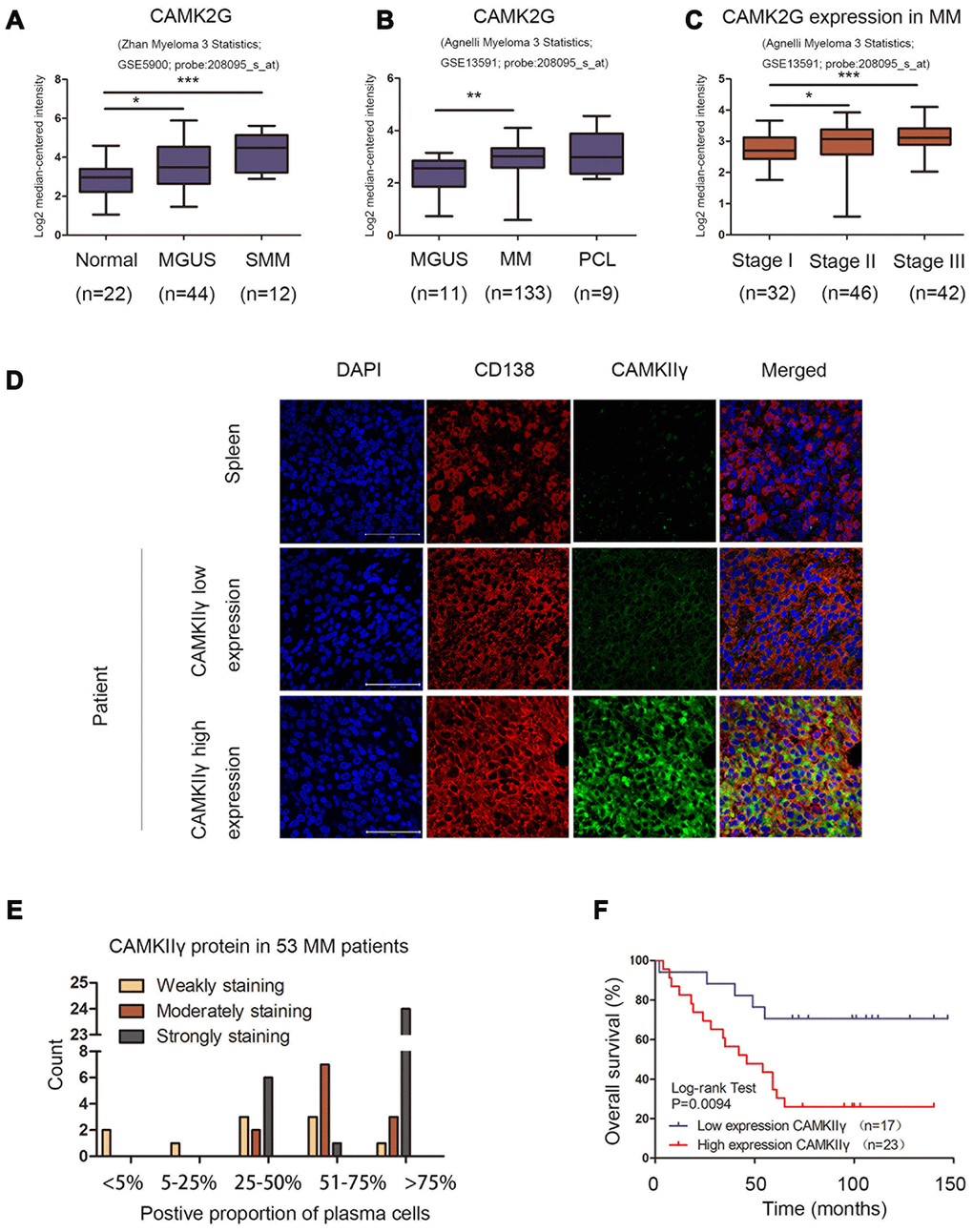 H&E and CD138 immunostain of serial sections were obtained from the department of pathology. The staining density and positive staining rate of each slide was evaluated by an experienced pathologist. The quantity score evaluated the positive proportion of plasma cells for CAMKIIγ protein was recorded as 0 (< 5% labelled cells), 1 (5% to 25% labelled cells), 2 (26% to 50% labelled cells), 3 (51% to 75% labelled cells), 4 (> 75% labelled cells). The intensity of immunostaining was scored as 0 (no immunostaining), 1 (weakly immunostaining), 2 (moderately immunostaining) and 3 (strongly immunostaining). A final score was calculated by multiplying the staining extent and intensity scores. Final score < 8 was defined as low CAMKIIγ expression, and high expression with a final score ≥ 8.