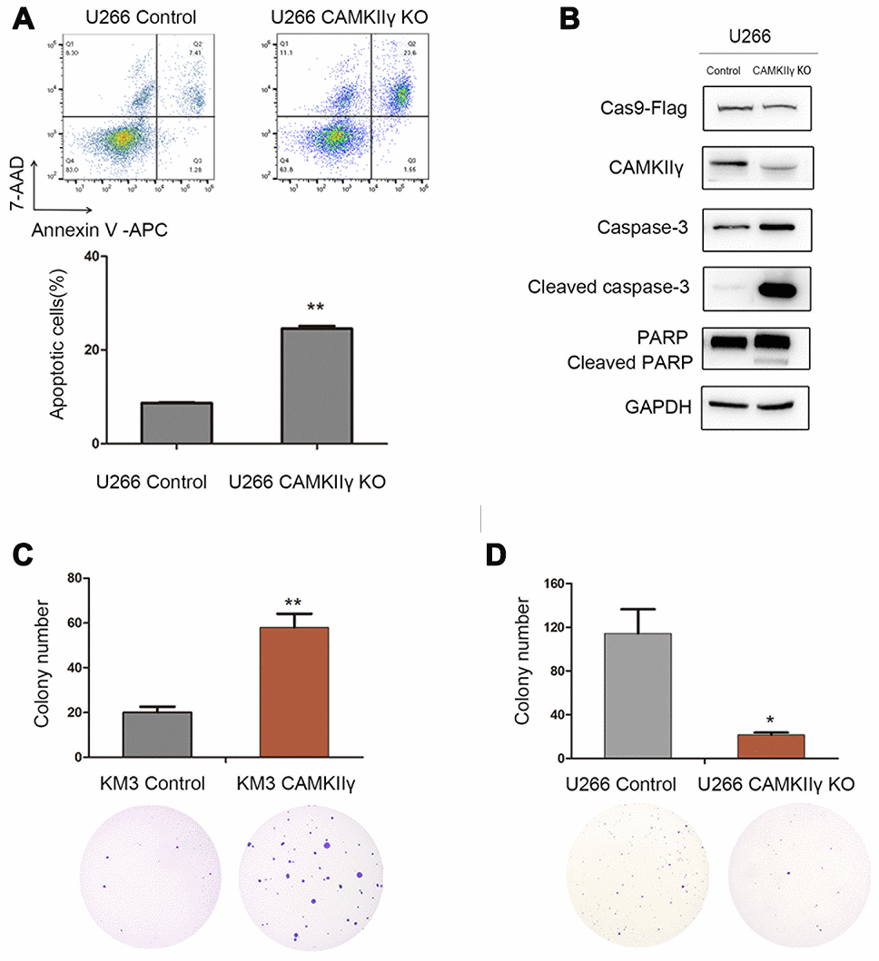 The results of Western blot showed the expression profiles of CAMKIIγ protein in five human MM cell lines (Figure 2A). KM3 and U266 were used to construct stable-transfected cells of CAMKIIγ overexpression (KM3-CAMKIIγ and U266-CAMKIIγ) and corresponding controls. Meanwhile, the CAMKIIγ-dependent MM cell proliferation was confirmed by CRISPR/CAS9-mediated CAMKIIγ knockout (U266 CAMKIIγ KO; U266 control). CAMKIIγ overexpression or knockout efficiency was measured by Western blot (Figure 2B). In order to study the effects of CAMKIIγ on MM cell viability and proliferation ability, we performed MTT assay and colony formation assay. The MTT assays exhibited that ectopic expression of CAMKIIγ markedly enhanced cell proliferation as compared with the controls (Figure 2C, left and middle), whereas the downregulation of CAMKIIγ suppressed cell growth (Figure 2C, right). Additionally, we found high CAMKIIγ expression promoted colony formation (Figure 3C) and the colony-forming capacity was inhibited in CAMKIIγ knockout group (Figure 3D). Furthermore, CAMKIIγ depletion displayed G0/1 phase arrest and G2/M phase decrease (Figure 2E). On the contrary, CAMKIIγ overexpression promote cell cycle of MM cells (Figure 2D). Importantly, CAMKIIγ knockout led to a significant increase of cell apoptosis in U266 cells (Figure 3A) with a concomitant increase of cleaved Caspase-3 and cleaved PARP (Figure 3B).