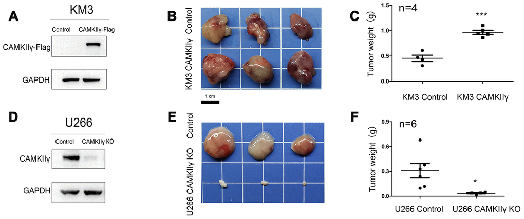 To establish xenograft model, cells were subcutaneously injected (KM3 control, KM3 CAMKIIγ; U266 control, U266 CAMKIIγ KO: 1.5x10^7 cells in 0.2 mL PBS per site) into the left groin of nude mice. After the development of palpable tumors, mice in groups of U266 transfected cells would receive 0.4 mL DOX (10mg/ml) to initiate CAMKIIγ silencing via oral gavage once a day. The mice were sacrificed and the subcutaneous tumors were dissected out, when the largest tumor within the same group reached 1.5 cm in diameter.